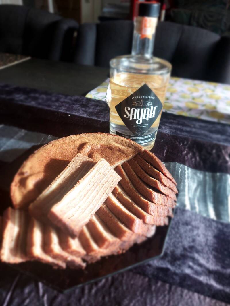 Deze spekkoek is anders dan de Traditionele spekkoek. Waarom anders? We hebben een likeur er doorheen gedaan. Likeur heet Sayah. We hebben onze spekkoek met de likeur samengevoegd. Tijdens het bakken vervliegt de alcohol, maar niet de smaak. Het resultaat is dat er een sterkere intense spekkoekkruidensmaak optreedt.